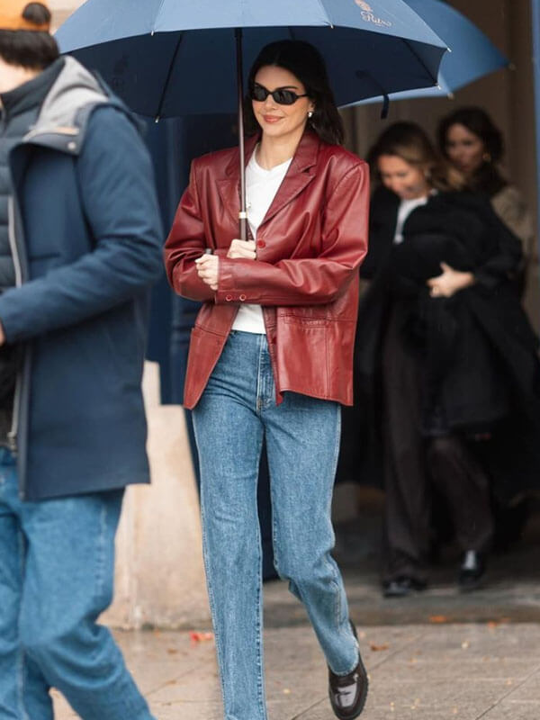 Paris 2025 Kendall Jenner Maroon Leather Blazer